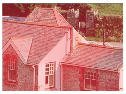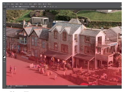 使用画笔工具把对面街道的所有屋顶都添加到快速蒙板的选择范围内,调整时可使用快捷键[、]控制画笔的大小。另外还要将所有你认为与建筑物距离相机距离相当的景物全部添加至快速蒙板中。