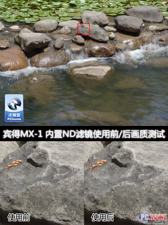 我们可以看到,在ND滤镜和三脚架的帮助下,拍出水川流不息的场景是完全没有问题的。那么,画质在使用前/后会不会有变化?小编针对同场景拍摄100%截图进行对比测试。