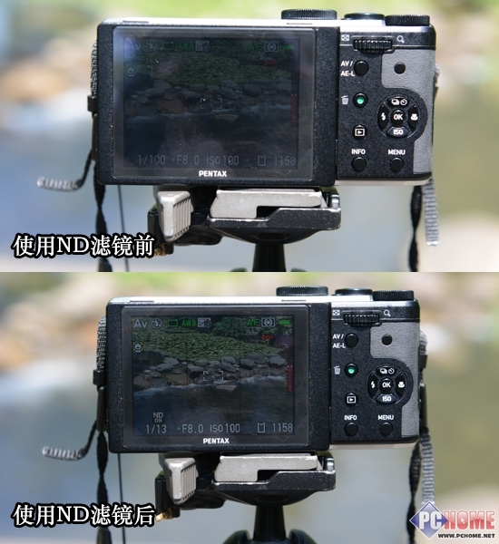 宾得MX-1内置ND滤镜,在光线条件充沛及光线明暗反差条件比较大的情况有很大的帮助,尤其在夏日是用大光圈拍摄时能够达到过滤强光的作用。首先,我们对打开ND滤镜前后的快门速度进行对比: