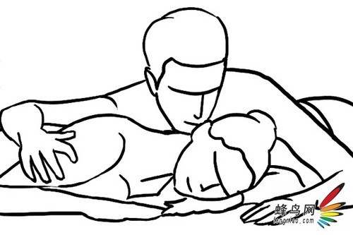 让女方俯卧,同时身体稍向镜头方向调整,目光看向镜头。男方从另一侧,同样俯卧于女方的背部之上,同时用手挽住女方肩膀,目光落于女方肩背部。