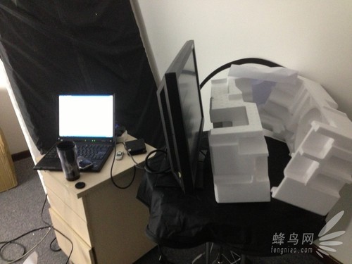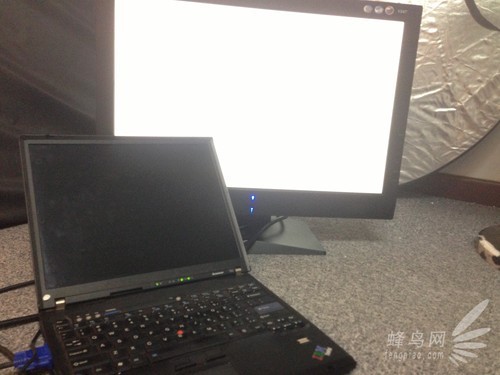 说了那么多装备了,具体使用方法如下:将显示器与笔记本相连,以显示器为主显示。使用白色做显示器背景,将显示器倒扣在泡沫塑料搭建成的柔光箱内。柔光箱下的黑布来自于我常用的反光板,如果有更高档的黑色天鹅绒布使用,效果更佳。