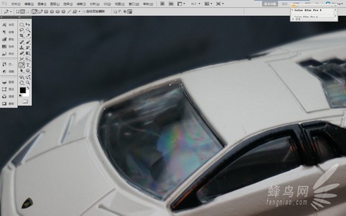 首先来讲解1:64比例的小车模型该如何处对原片瑕疵进行处理。通过对原片的观察,由于风挡玻璃的材质问题,造成了模型车玻璃有很多色斑,所以在后期处理照片时,首要做的便是要将这些色斑进行消除,具体方法如下: