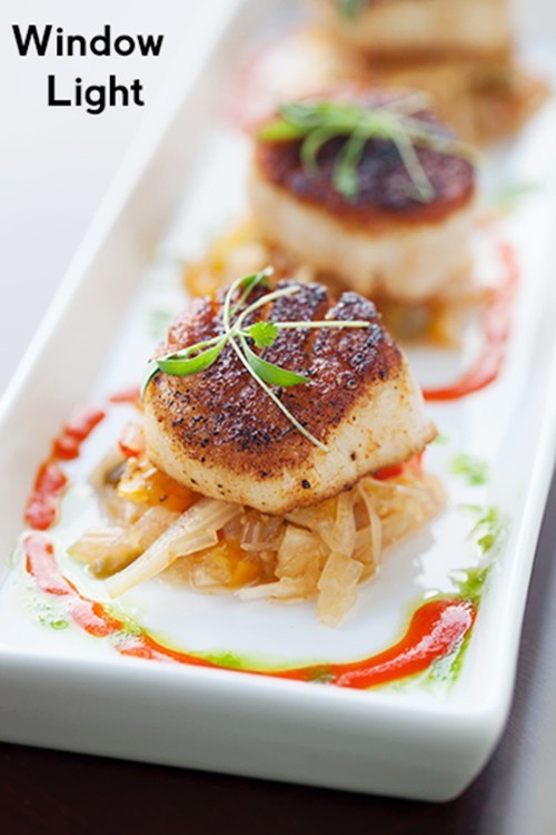 很多餐馆都有木制桌面,这种桌面会有反射光线的效果,而大面积的窗户光则可以为画面提供大面积的反射区域。如果窗户面积较小,或是桌面材质不同,可能画面光线的效果会有所不同。这时可以调整食物位置与拍摄方向,以达到最佳的效果。一般而言,餐厅桌面都是会反光的。