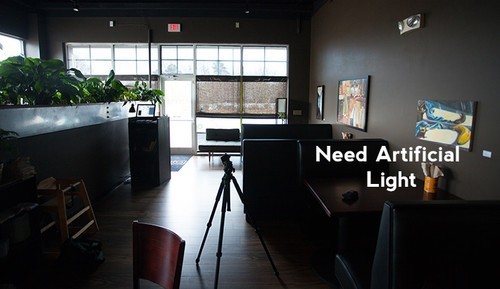 并不是所有餐厅都有超大的落地窗户以提供明亮光线。在这个拍摄环境之中,你可以发现左边有一堵墙挡住了窗户光,而正面的窗户光与我们拍摄地点的距离比较远。这是餐厅里比较阴暗的角落,在这里拍摄需要人造光的帮助!