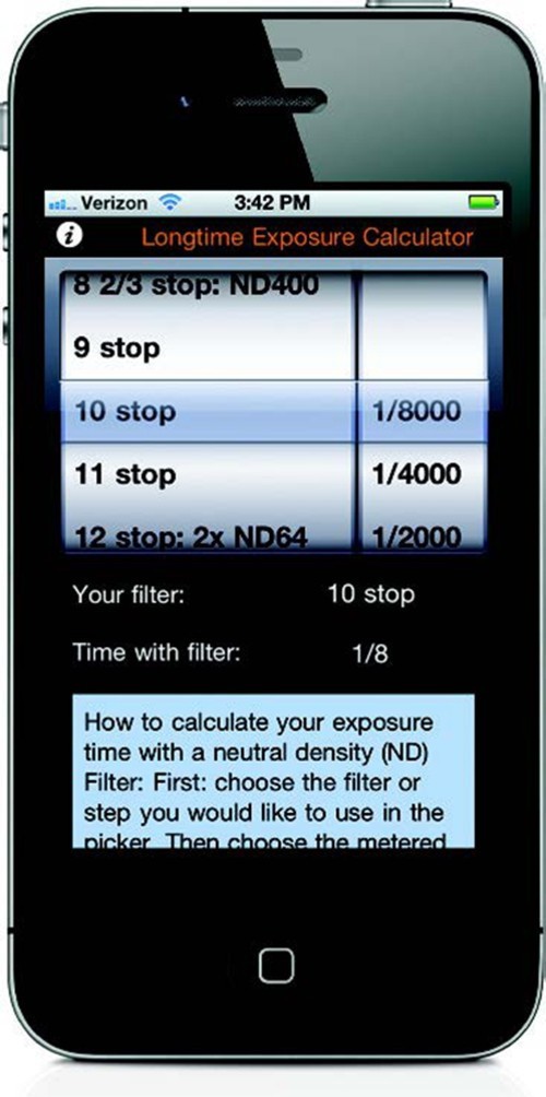 所有设置都准备好之后,是时候拍照啦。现在只剩下一个问题:要取得合适的曝光,快门要打开多久?当然,你可以试验不同的曝光时间,几次之后,你就可以得出 合适的效果。但我有一个更快的办法:如果你有iPhone,你可以到App 商店下载一个免费的长时间曝光计算器(LongTime Exposure Calculator)App,它会帮你计算曝光。你只需选择当前使用的是什么滤镜(8 挡、10 挡等),然后它就会告诉你快门要打开多久。