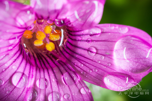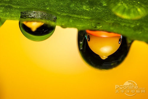 MP-E65,微距水滴,放大4倍,F16的光圈,用脚架慢慢接近,用了一只580从正上方打光,鸭子玩偶就放在水滴的背后,让他的倒影印到水滴重。后期增加了对比度。
