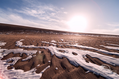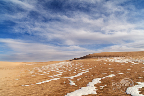 21ZE拍的到此一游风景,日落时分,地上有雪和沙。采用了标准的三分法风景构图,对天空测光,F8的光圈。后期适当增加了对比度并把色调适当调红增加日落时分的温暖感。