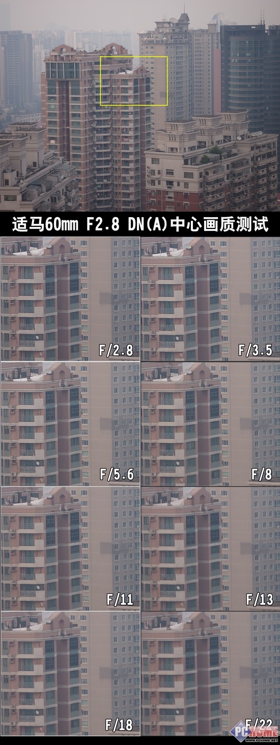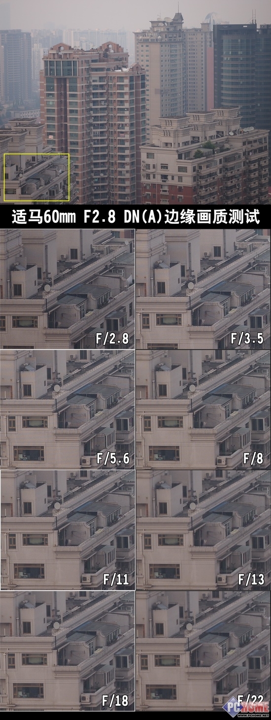 在实际测试的100%截图我们可以发现,这颗镜头在最大F/2.8光圈下能够表现出很好的锐度,通过截图中窗户和栏杆的细节可以很明显的发现。在f/3.5-f/5.6的时候依旧可以表现出足够的锐度,但是经过F/8这个光圈级之后,锐度下降非常明显,在F13以后的细节表现似乎不太尽如人意。