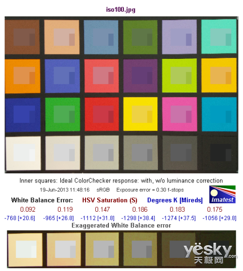 白平衡偏移方面,曝光值误差在0.30,白平衡没有偏移。白平衡方面,色温5500K的光照环境下,ISO 100时的偏移还不错,最高处为0.183,色温偏移数值为-1056,白平衡偏暖。