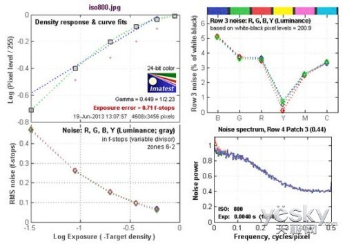 ISO800的最高躁点值为0.7左右,噪点控制的相当的好。从Row 3 noise:R,G,B,Y(Luminance)图表中可以看到,在蓝色上是以红色通道的噪点为最多,达到3.2左右。红色上是以蓝色通道的噪点为最多,达到5.1左右。绿色通道的噪点最高值出现在红色上,达到3.8左右。