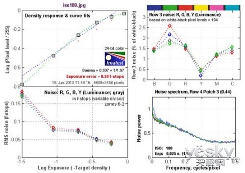 ISO 100的最高噪点值为0.16左右,属正常情况。从Row 3 noise:R,G,B,Y (Luminance)图表中可以看到,在蓝色上是以红色通道的噪点为最多,达到2.1左右。 红色上是以蓝色通道的噪点为最多,达到0.2左右。绿色通道的噪点最高值出现在红色上,达到1.08左右。