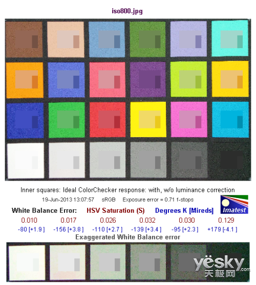 白平衡偏移方面,曝光值误差在0.71,曝光略过度。白平衡方面,色温 5500K的光照环境下,ISO800时的偏移最高处为-95,色温偏移数值为+179,白平衡偏暖。