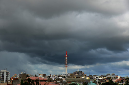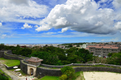 冲绳的天气是雨来得快去的也快,我们所站的城楼还是晴空万里,远处已经乌云密布。可以瞬间从阳光明媚变成大雨滂沱。