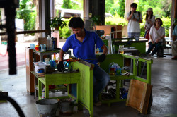 午餐是冲绳特产的面食,不过我显然对吃没有太大的兴趣,匆匆拨拉了几口就到门口去晃晃。冲绳虽然温度不低太阳也很毒辣,但站在树荫底下依然会有味道很好闻的风吹过,也挺凉爽。
