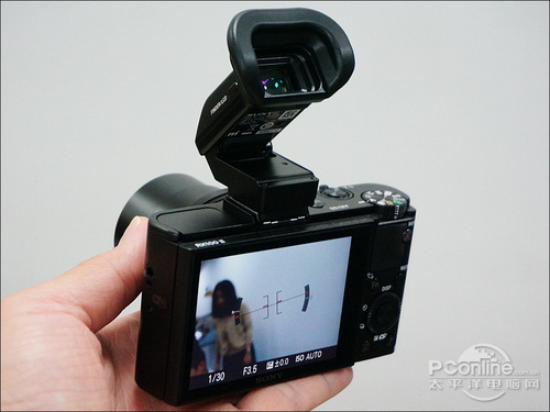 RX100 II能用的EVF就跟RX1、RX1R那只一样,均为236万点规格,带有眼感。不过RX100 II的机身确实小,配上这样一个EVF时显得有点头重脚轻。
