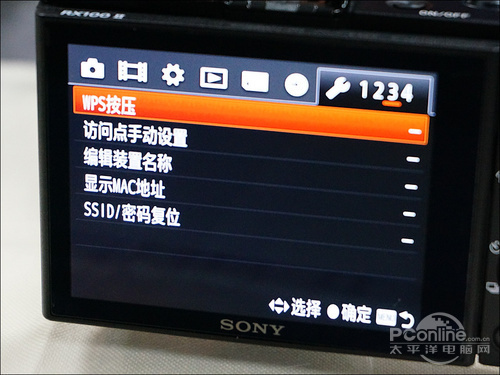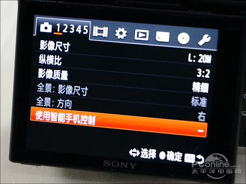 我在菜单第一页就发现这个选项了,使用智能手机控制,意味着我们可以使用手持设备对RX100 II进行遥控拍摄了(把手机当成遥控器),这比之前NEX-6、NEX-5R的Wi-Fi功能又进一步了。