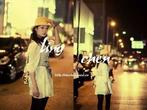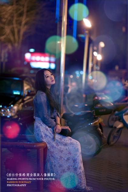 在这张照片里,我们为了获得背景灯光虚化效果,我们特别选择了具有大光圈的NIKON 85mm F1.4大光圈镜头,将光圈设置在2,利用大光圈获得明显的背景光斑效果。从照片上我们可以看到,背景的光斑很好地衬托了模特的表情,让整个夜景人像比白 天的人像显得更柔美,和谐。