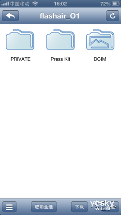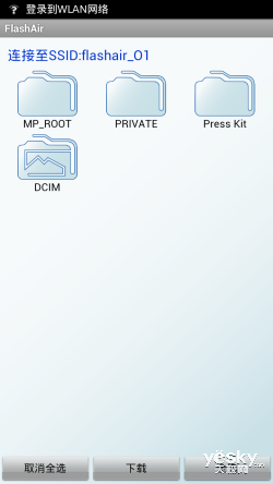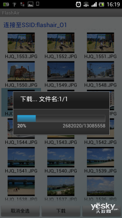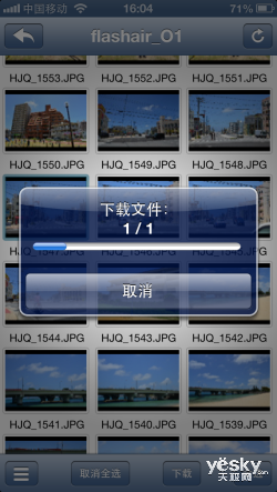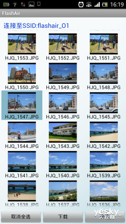 接着就可以选择想要的那一张,并点击屏幕下方的下载按钮,照片就会从存储卡里保存到手机里。两个系统的的页面略有不同,安卓的系统显示有百分比。不过这个影响也不大,因为新FlashAir的传输速度非常快,几秒内一张照片就下载完毕。