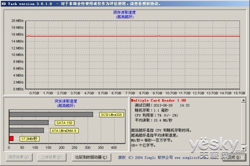 HD Tune Pro测试和HD Tach项目基本重合,也能够绘出介质内部传输速率曲线,同时在寻道时间测试中还能显示测试取样的点阵,更加直观。从测试结果看,该卡的素质依旧稳如泰山,整条测试曲线近乎于平直,波动很小,平均值与最大值十分接近,完全符合Class 10的速率标准。