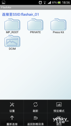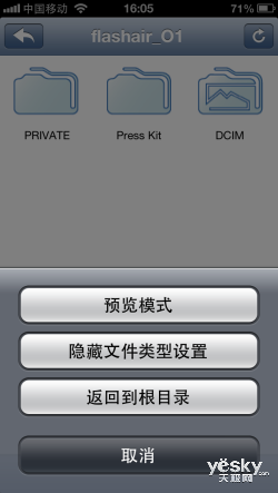在根目录界面中,iOS系统和Android系统均有菜单键,iOS系统的菜单键设置在应用中,有工具按钮,有预览模式、隐藏文件类型设置、返回到根目录三个选项。Android系统的菜单设这更丰富,有设置、刷新、预览模式、重新连接返回到根目录5种。菜单键的设置差别源于两种系统的不同,试用后都非常便捷。