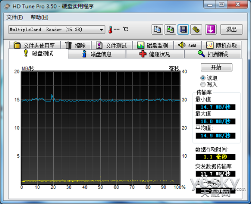 HD Tach读速度测试不依赖于文件系统,曲线成绩基本相当于硬盘内部传输速率测试。体现的是很理想化的硬盘速度,其外延部分大约是磁盘性能表中buffer to disk项目的反映,而真实应用中,极少有机会达到这样的高度。