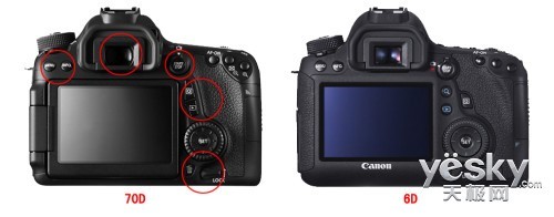 从图片上来看70D后背按钮分布更接近6D,位于取景器左侧分别为MENU按键和INFO按键,而取景器右侧的按键自上而下分别是实时取景和视频按钮、Q按钮、回放键、转盘,删除以及锁定转盘拨杆一系列操作按钮组成,这样的按钮分布更加方便了使用者在拍摄时右手单手操作的便捷性,无论是摄影还是视频右手足以单手进行操作和调整,对于使用者而言这样的按钮布局更加方便。