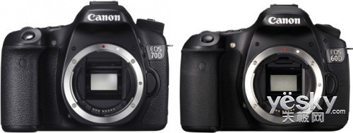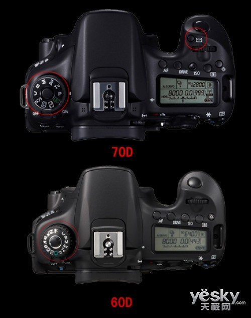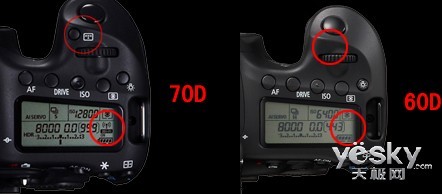 俯看70D和60D的改动最主要的位置还是位于相机左肩的转盘。由于70D的定位更加趋于准专业的单反用户,70D的转盘仅保留了P、AV、TV、M、B、C以及创意场景等常用档位,转盘风格变得更加清晰、简洁、易操作。