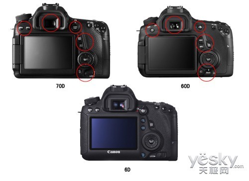 看完肩屏对比,我们再来看看70D的后背有什么变化吧。首先,从整体来讲70D的后背和60D相比并无太大的变动,除了那块3寸触控旋转屏外,在按钮分布上略有改动,个人感觉70D的按键分布更接近全画幅的6D。
