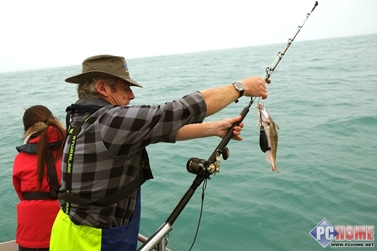 到达雷达显示的鱼群区域后MARK大叔将船熄火,我们准备正式开始下杆钓鱼,虽然天气不好,但是MARK大叔热情不减又是教我们下杆又是帮我们拉钓上来的鱼,我们也跟着他忙的不亦乐乎。