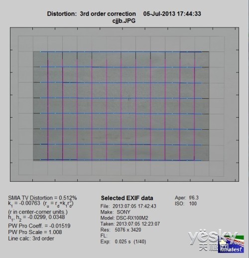 RX100 II广角端的桶型畸变数值为0.321%,桶型畸变控制得还可以。而长焦端的畸变数值为0.512%,枕形畸变也控制得很不错。这次畸变测试得到的结果证明了RX100 II镜头表现还是基本可以满足拍摄需求的。