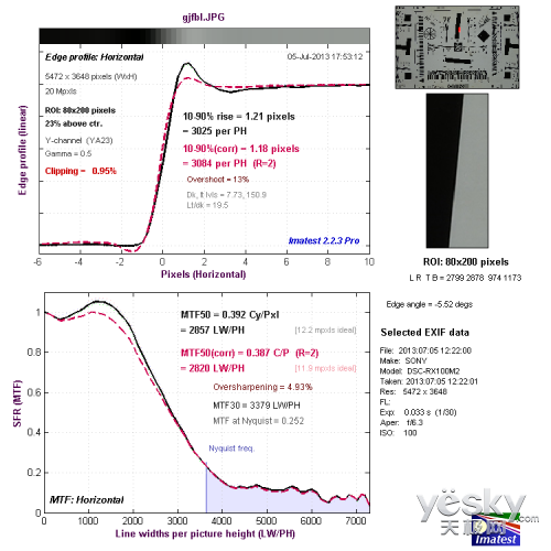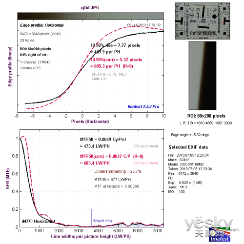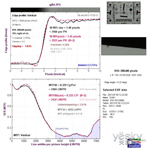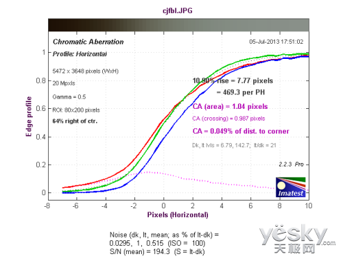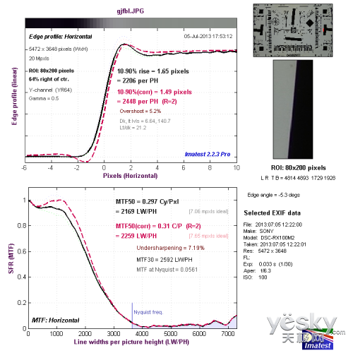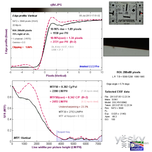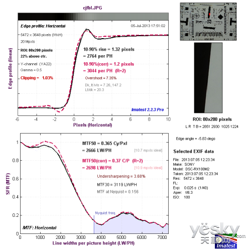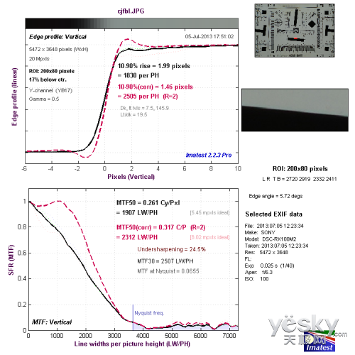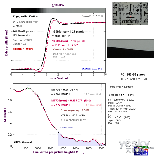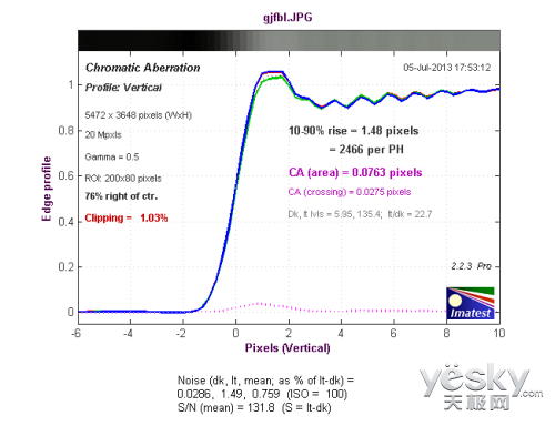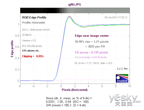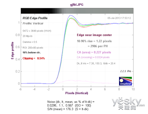 从边缘水平分辨率测试的结果看,分辨率达到了2259LW/PH,达到优秀的水平,机内进行了一定的锐化,出现了驼峰现象。