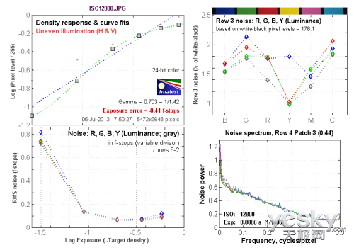 ISO 12800的最高噪点值为0.81左右,噪点正常。从Row 3 noise:R,G,B,Y (Luminance)图表中可以看到,在蓝色上是以蓝色通道的噪点为最多,达到1.7左右。 红色上是以绿色通道的噪点为最多,达到1.75左右。绿色通道的噪点最高值出现在蓝色 上,达到2.2左右。