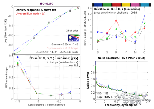 ISO 100的最高噪点值为0.39左右,属正常情况。从Row 3 noise:R,G,B,Y (Luminance)图表中可以看到,在蓝色上是以蓝色通道的噪点为最多,达到0.9左右。 红色上是以红色通道的噪点为最多,达到1.1左右。绿色通道的噪点最高值出现在红色 上,达到0.91左右。