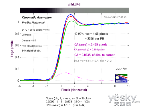 从广角端中心垂直方向色散测试结果来看,色散区域为0.227像素,蓝色通道的色散高于其他通道。