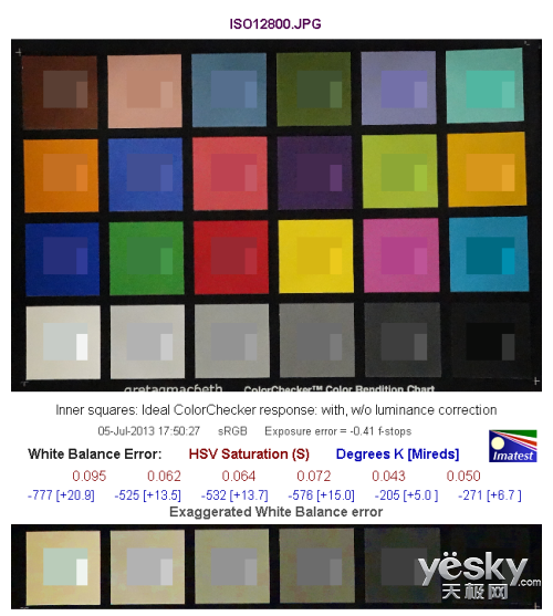 白平衡偏移方面,曝光值误差在-0.41,白平衡没有偏移。白平衡方面,色温 5500K的光照环境下,ISO 12800时的偏移最高处为0.095,色温偏移数值为-777,白平衡偏暖。