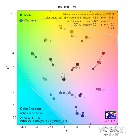 从ISO 100时的色彩偏移的情况看,RX100 II的色彩饱和度为113.9%,最大偏移量为9.31。红色区域的偏移相对稍大,其它色彩虽有偏移但都不大。