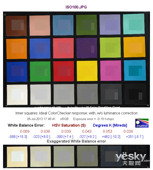 白平衡偏移方面,曝光值误差在-0.19,白平衡没有偏移。白平衡方面,色温5500K的光照环境下,ISO 100时的偏移非常好,最高处为0.069,色温偏移数值为-589,白平衡偏暖。
