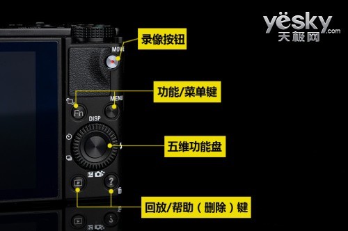最后我们看到的是RX100 II的功能操作区域,设计与RX100完全相同。有录像按钮、Fn按键、菜单按键、五维功能盘、照片回放按键及帮助按键。但又一点要注意,不知道是不是翻转屏的关系,在靠近翻转屏一边的五维功能盘按下去的触感并不强烈,会造成操作上的一些不便。