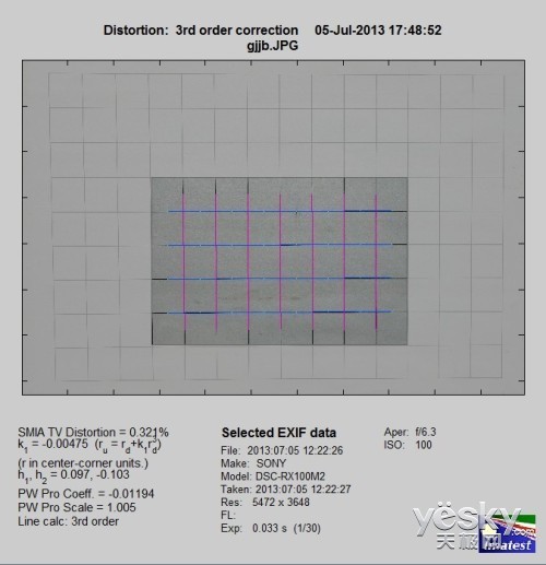 我们使用Imatest对本次评测所使用的RX100 II的分辨率与色散情况进行了测试,大家可以将测试所得的分辨率结果与上图标准进行比对,从而获得直观而明确的参考。