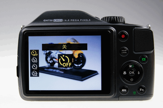 通过这个按键,用户可以设置自拍的时间,分别有10秒和2秒的时间提供用户选择。另外还有个连续自拍的功能,在这个模式下,相机先是进行一次10秒的自拍定时,拍完后紧接着进行一次2秒的自拍定时。这个功能的好处就是用户可以在第一次自拍完成后换一个动作,2秒后再拍摄下一张照片,而不用自拍完回到相机旁边按下快门才能进行第二次自拍。