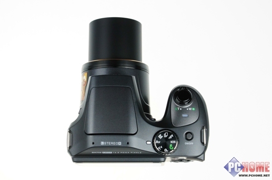 相机顶部,由上到下分别为快门键/变焦杆、LED指示灯,电源开关键和模式转盘。在左侧内置闪光灯后端还设置了带有风声消除功能(可在相机菜单内设置)的立体声麦克风。根据小编试用的感觉来看,模式转盘的手感很好,转动时没有丝毫的生硬感。快门键按下去非常地干脆,变焦杆变焦时也非常灵活。