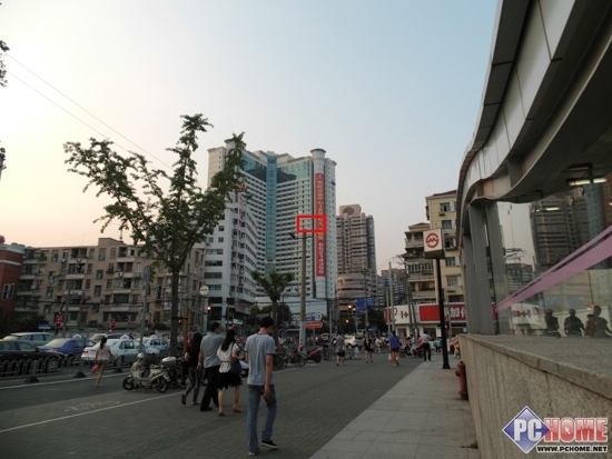 与GH650一样,GH750采用的也是同一款26X变焦比的镜头,光圈同样是F3.1-5.9,35mm等效焦距为22.3mm~580mm。下面是小编在四平路的海伦路地铁站附近拍摄到的画面,上图为镜头广角端拍摄的。而下图拍摄到的是上图中红框表示出来的部分,可见这款镜头不仅能够拍摄大场景,还能通过光学变焦拍摄到非常远的景物。