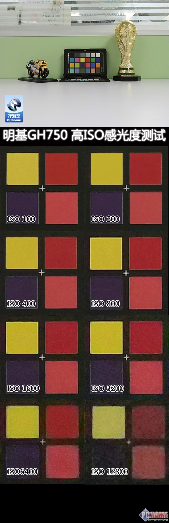 接下来就要到逢机必测的高ISO感光度测试环节,小编用三脚架将相机固定住,使用ISO100,F3.5,自动白平衡进行拍摄。以下是ISO100-12800时,标准色卡画面中心处的100%截图对比。