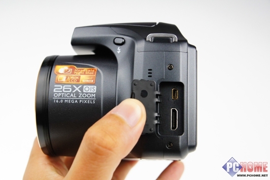 在明基GH750的左侧,还设有USB2.0接口和视频AV接口,方便用户用数据线将相机和电脑进行连接来进行数据传输。