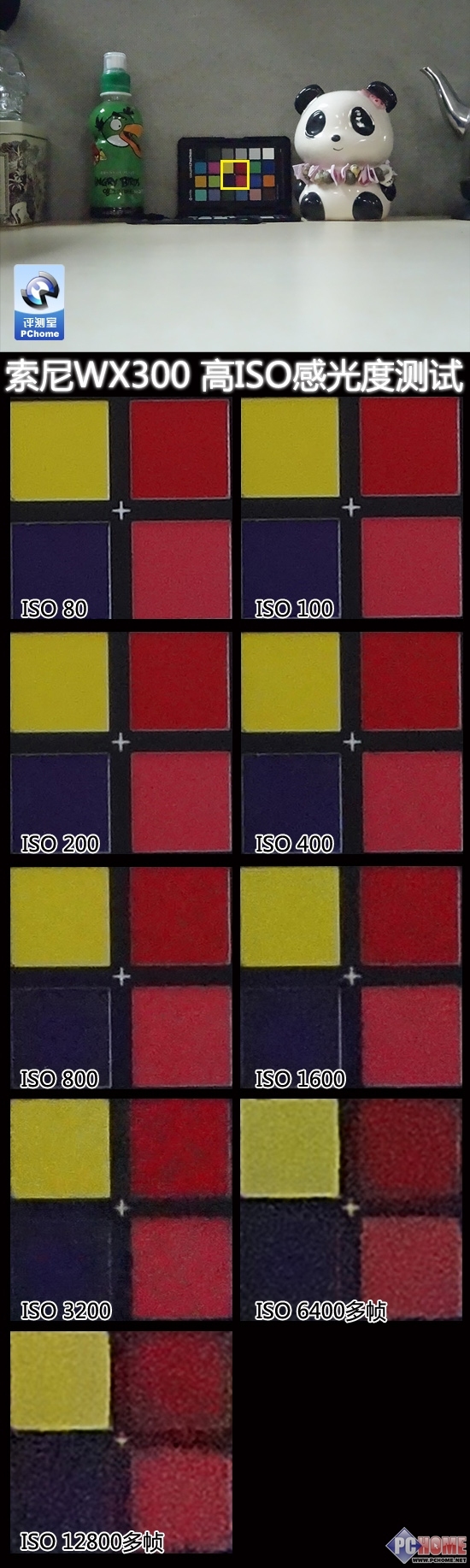 老规矩,我们把索尼WX300固定在三脚架上,开启最高画质精度、自动白平衡,关闭一切可能影响到画质的选项,然后使用各档感光度对画面中的标准色板进行拍摄。