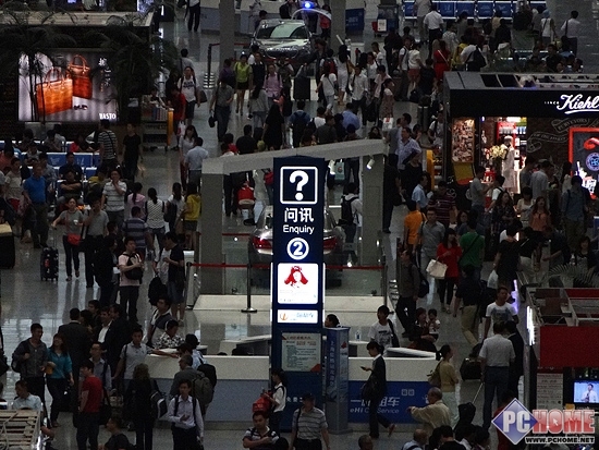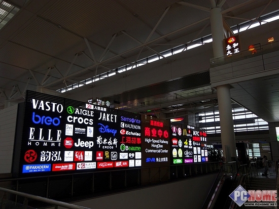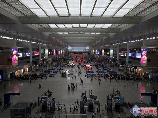 上海虹桥高铁站的室内全景照片,红色框标出的位置就是20倍变焦之后可以取到的景物范围。