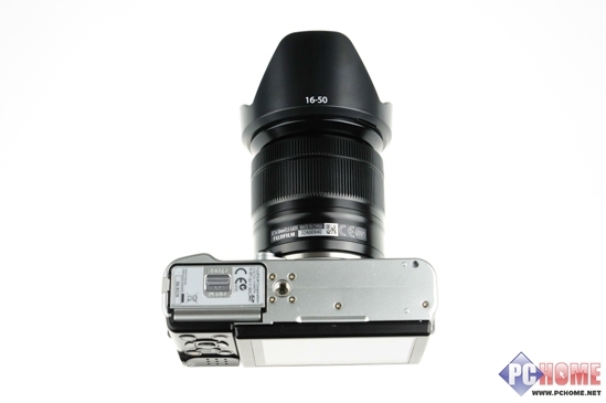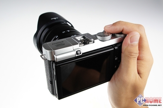 由于取消了取景器,因此在机顶有一个位置可以空出来安置X-M1的内置闪光灯。虽然X-M1以紧凑为主打,但是该有的热靴、各式功能转盘一个不少。而X-M1的转盘设计由前两代的快门速度和曝光补偿的转盘改为模式转盘和控制转盘,这也是为了更符合一般的用户群的使用习惯。