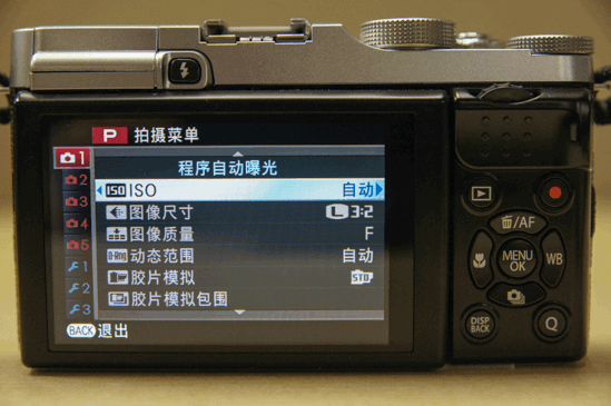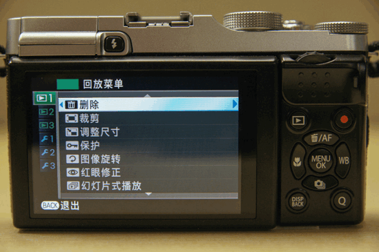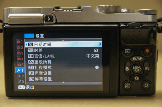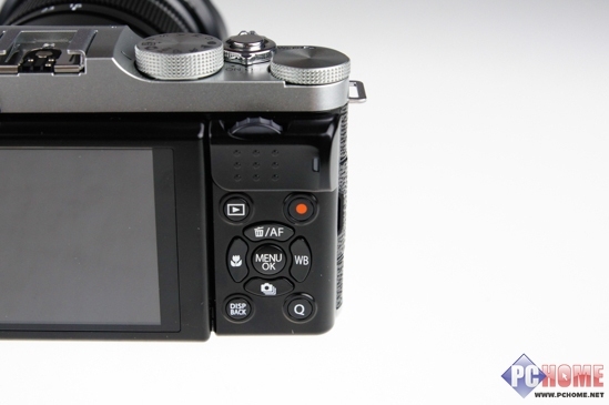 X-M1与前两代机型设计上截然不同的是,除了顶部的转盘外,要数机身背部的按键布局了。除了左边一排按键外,由于X-M1没有取景器,自然取消了VIEW MODE(查看模式)按钮。而X-M1的方向选择键更是集成了不同功能设定的按键,方便用户进行快速设定,值得一提的是,长按中间的MENU/OK键可以对方向选择键四个方向的按键进行锁定,防止在拍摄过程中发生误碰操作。