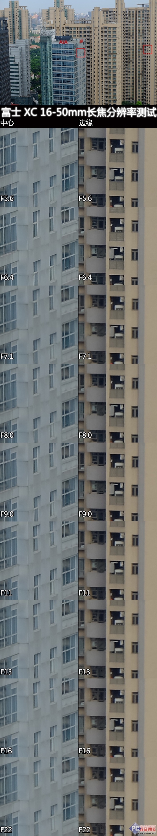 由于XC16-50mm镜头是浮动光圈,长焦端的测试光圈从F5.6起步。光圈全开时已经有不错的锐度,同样一直到F16有不错的锐度表现,而之后成像质量下降明显。