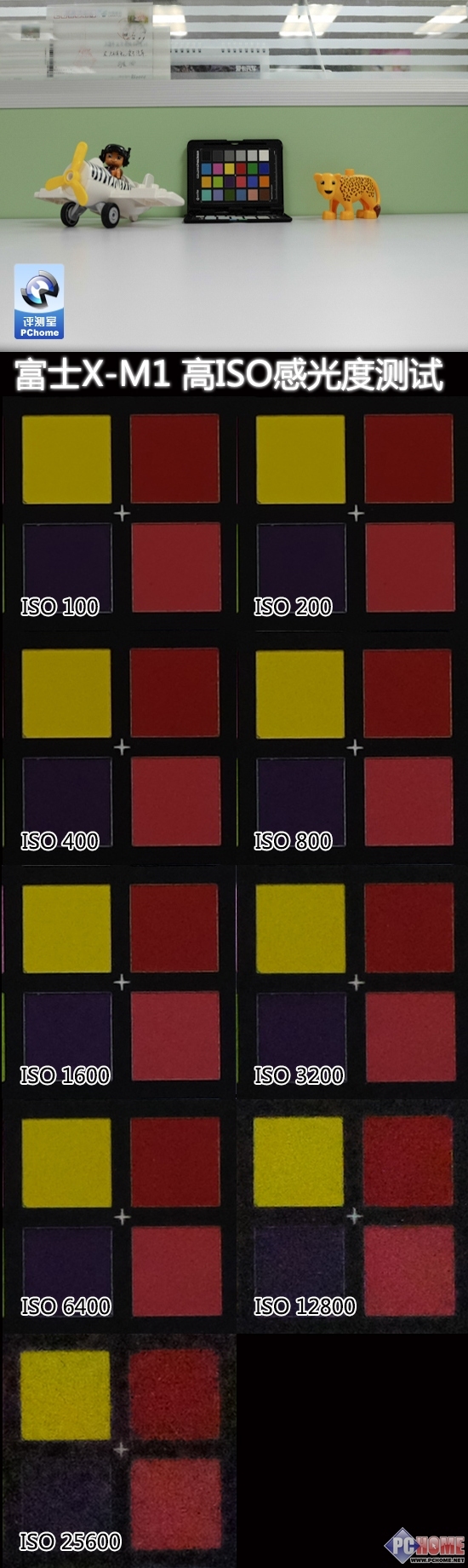 小编用三脚架将相机固定住,使用27mm左右的焦段,最大光圈F4.5,自动白平衡,机内设置为标准进行拍摄。以下是ISO100-25600时,标准色卡画面中心处的100%截图对比。